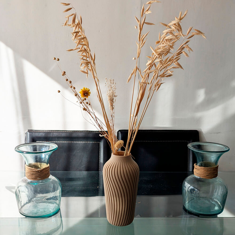 Este florero se produce mediante impresión 3D con un material de origen vegetal, una alternativa más amable con el planeta que muchos plásticos tradicionales. Así decoras con estilo y conciencia sostenible. ♻️