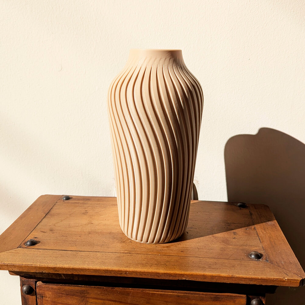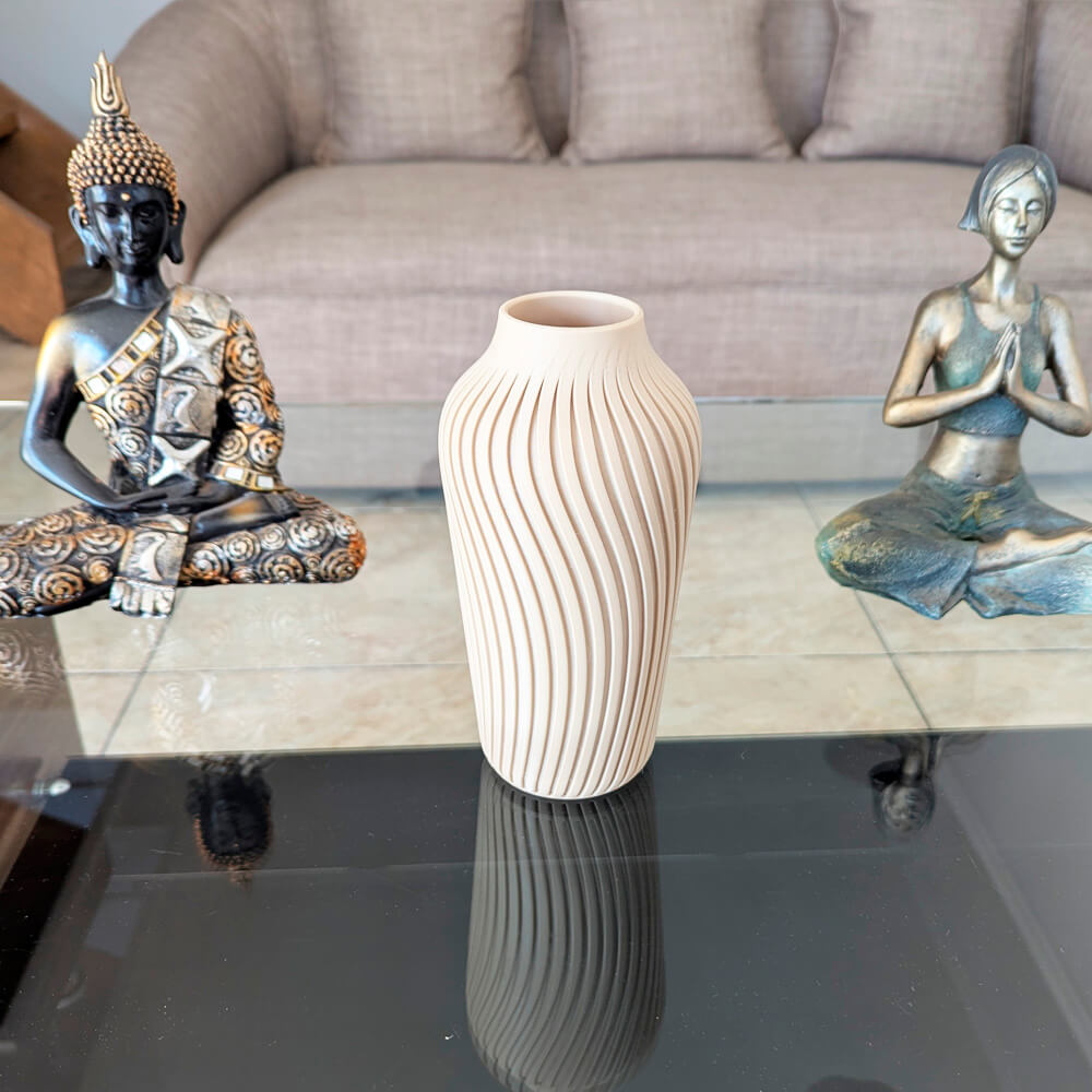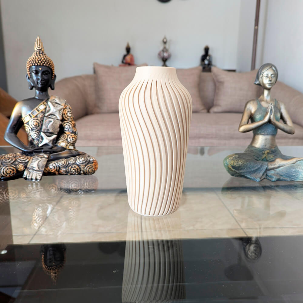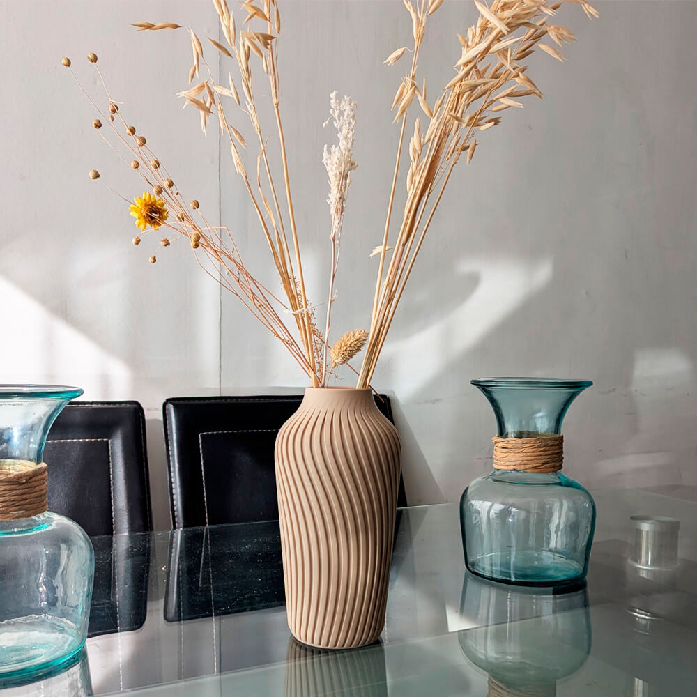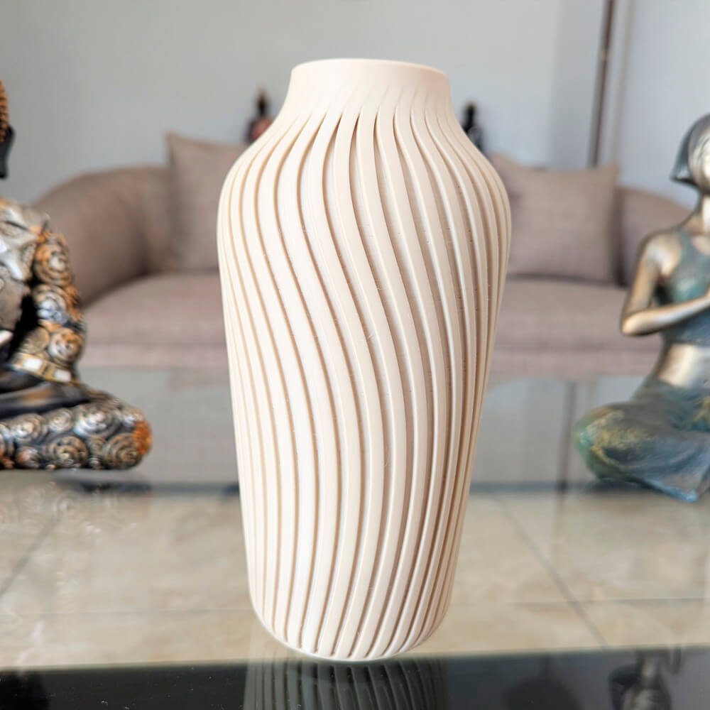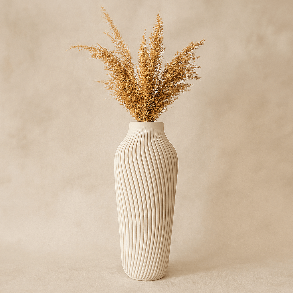 Florero 3D alto en color crema con elegante textura en ondas. Ligero, decorativo y hecho con material de origen vegetal más amable con el medio ambiente. Ideal para pampas, flores secas o ramas decorativas. ♻️🏡