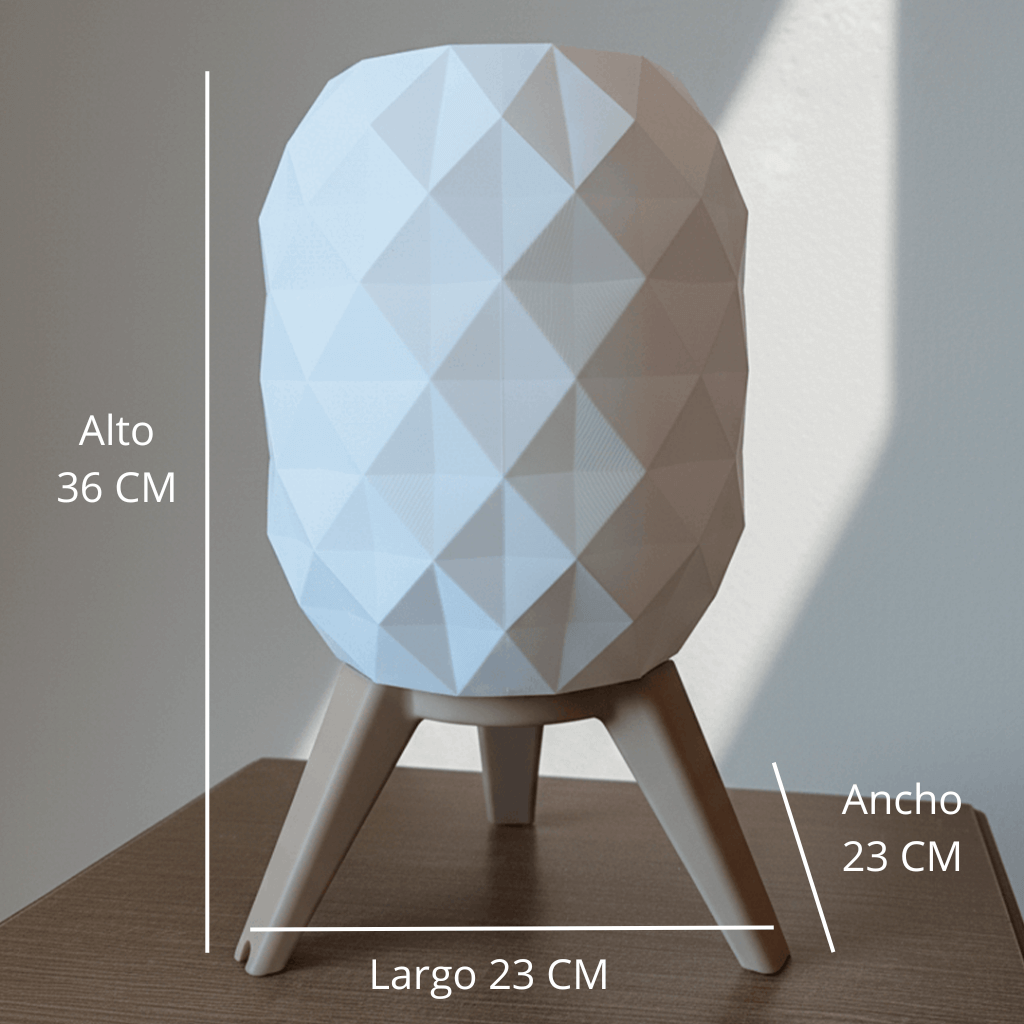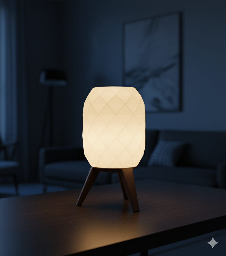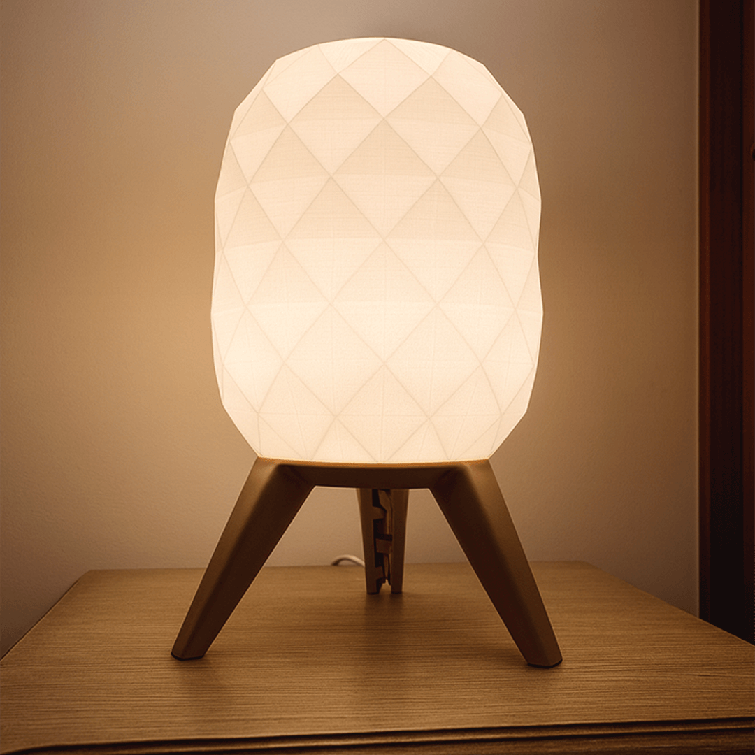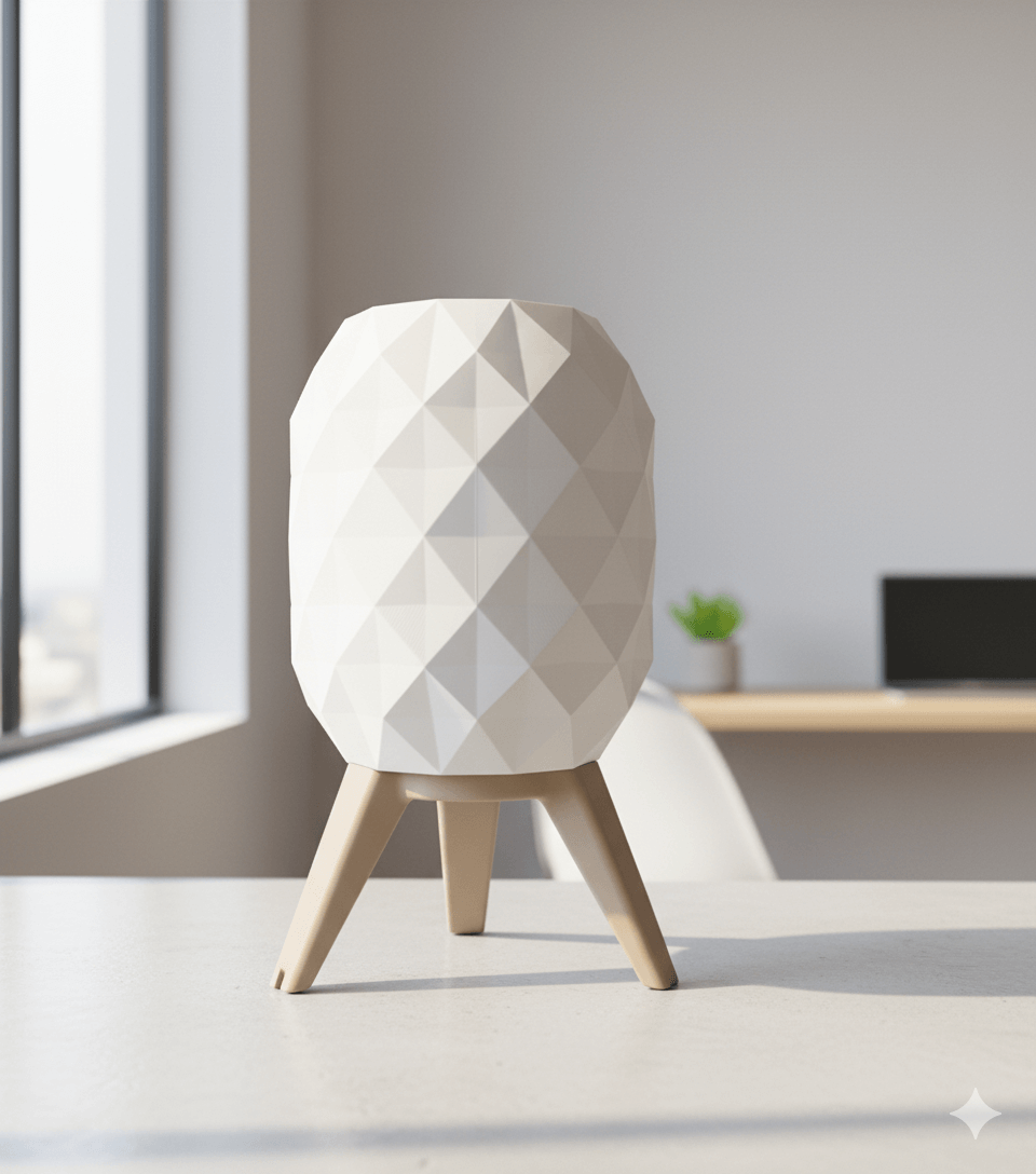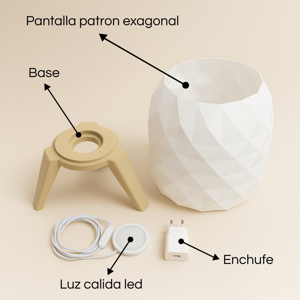 Lámpara de mesa estilo hexagonal impresa en 3D. Pantalla geométrica que difunde luz cálida tenue y base estable de tres patas. Diseño minimalista y moderno para velador, escritorio o living. Ligera, resistente y de bajo consumo.