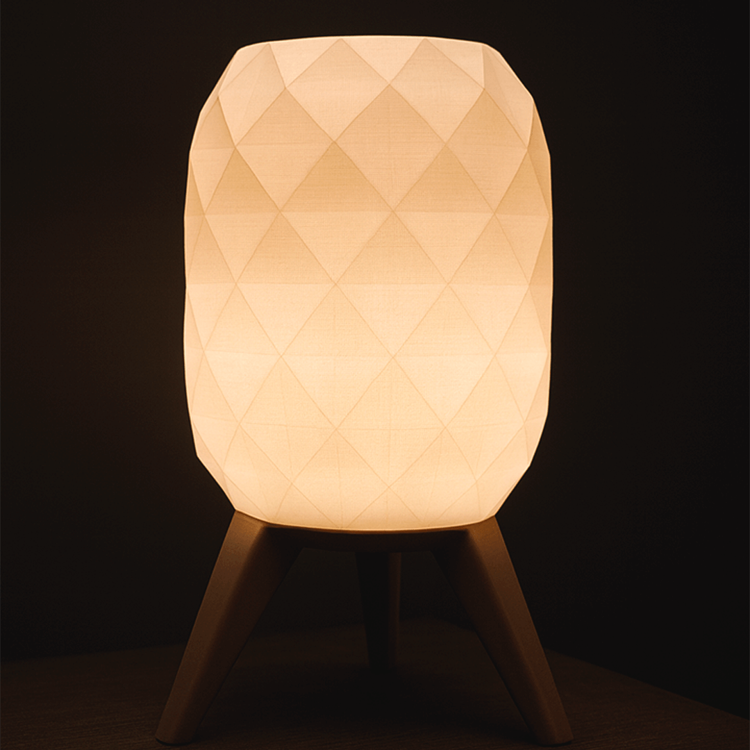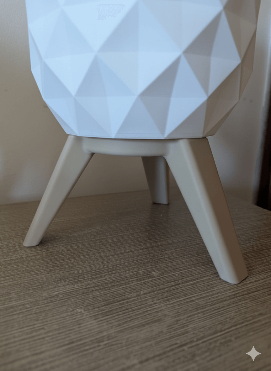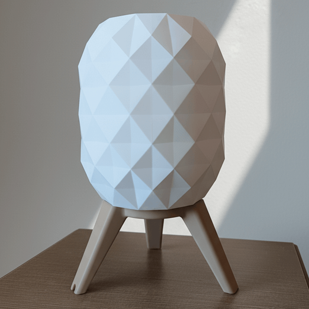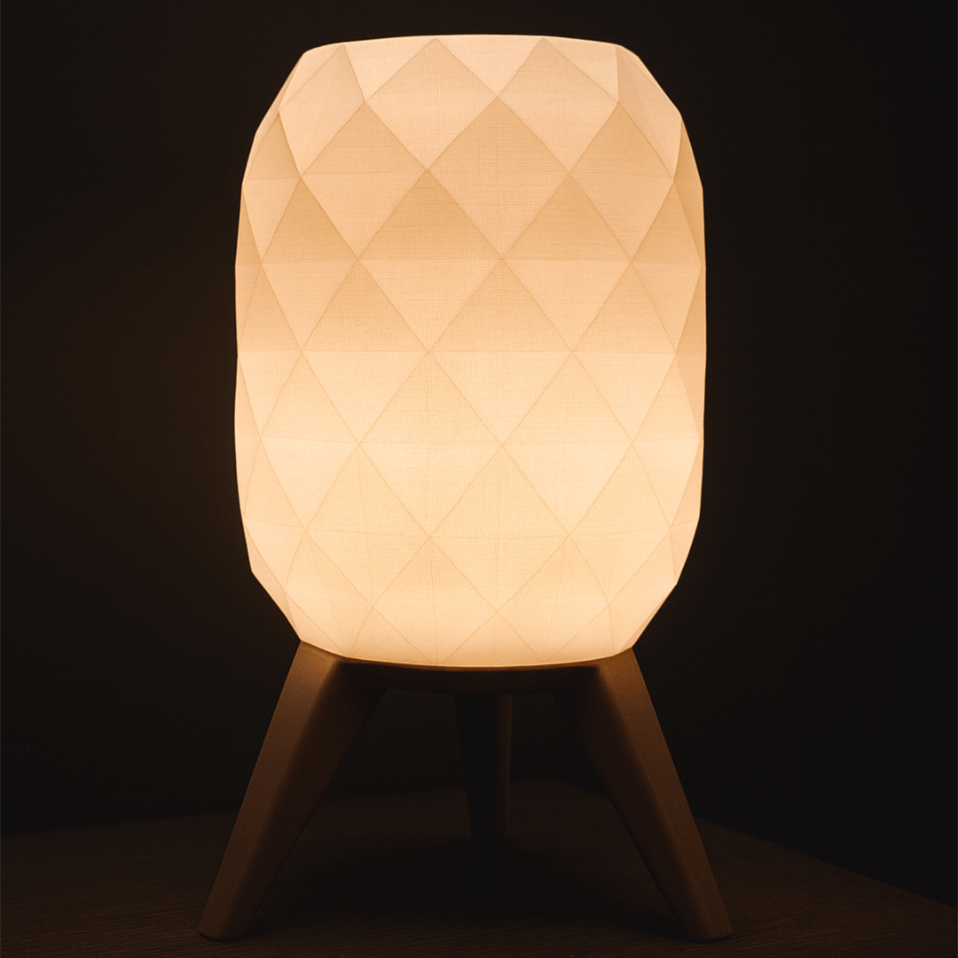 Lámpara de mesa estilo hexagonal impresa en 3D. Pantalla geométrica que difunde luz cálida tenue y base estable de tres patas. Diseño minimalista y moderno para velador, escritorio o living. Ligera, resistente y de bajo consumo.