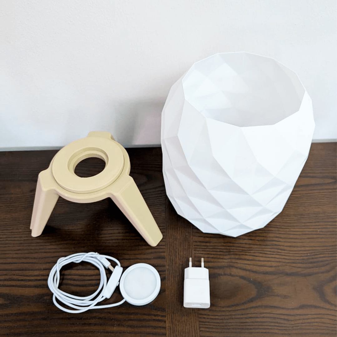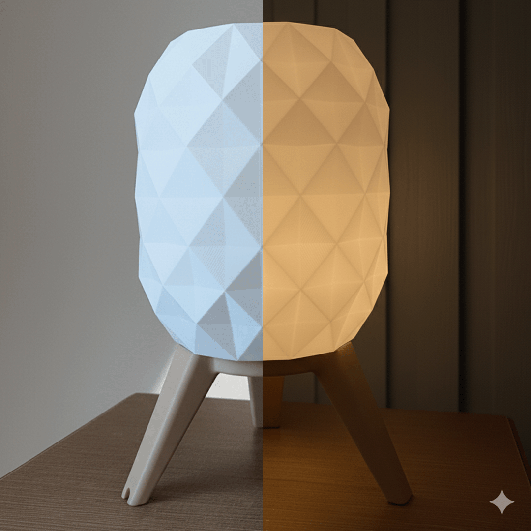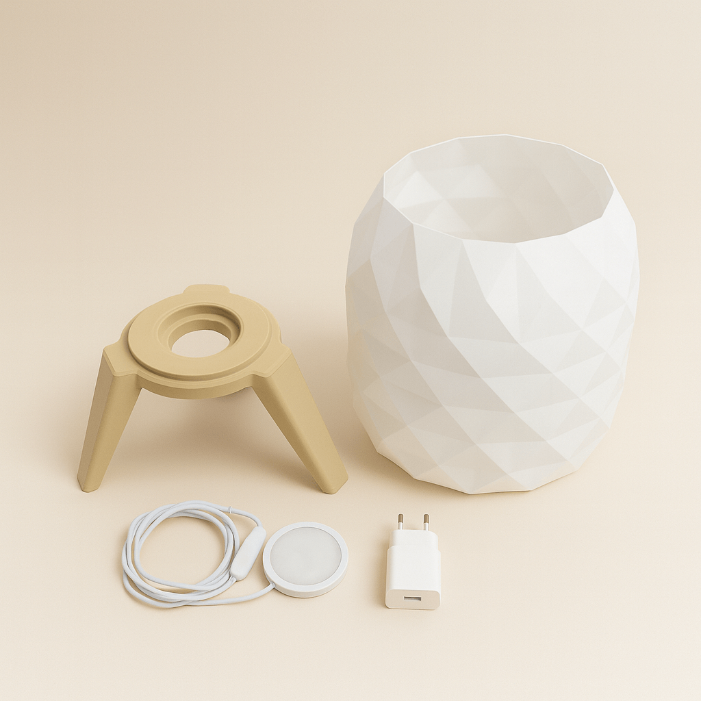 La Lámpara de mesa estilo hexagonal combina diseño contemporáneo y fabricación responsable. Su pantalla, impresa en 3D con patrón geométrico, crea un juego de luces suave y envolvente, perfecto para ambientes acogedores en dormitorio, sala de estar o home office. La base de tres patas ofrece estabilidad y estética limpia, integrándose con estilos nórdico, minimalista o moderno.