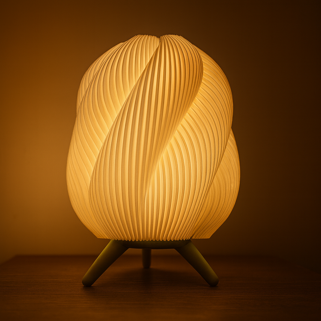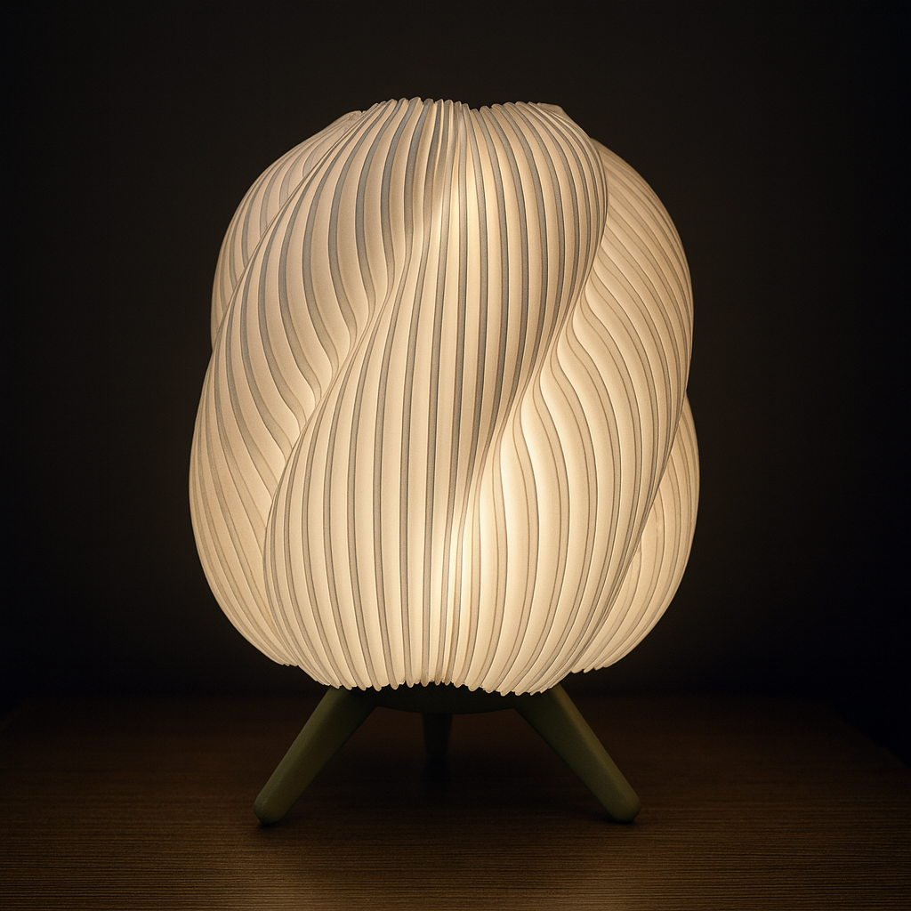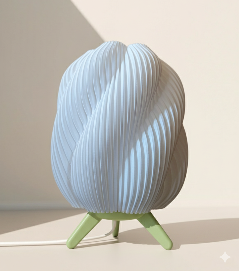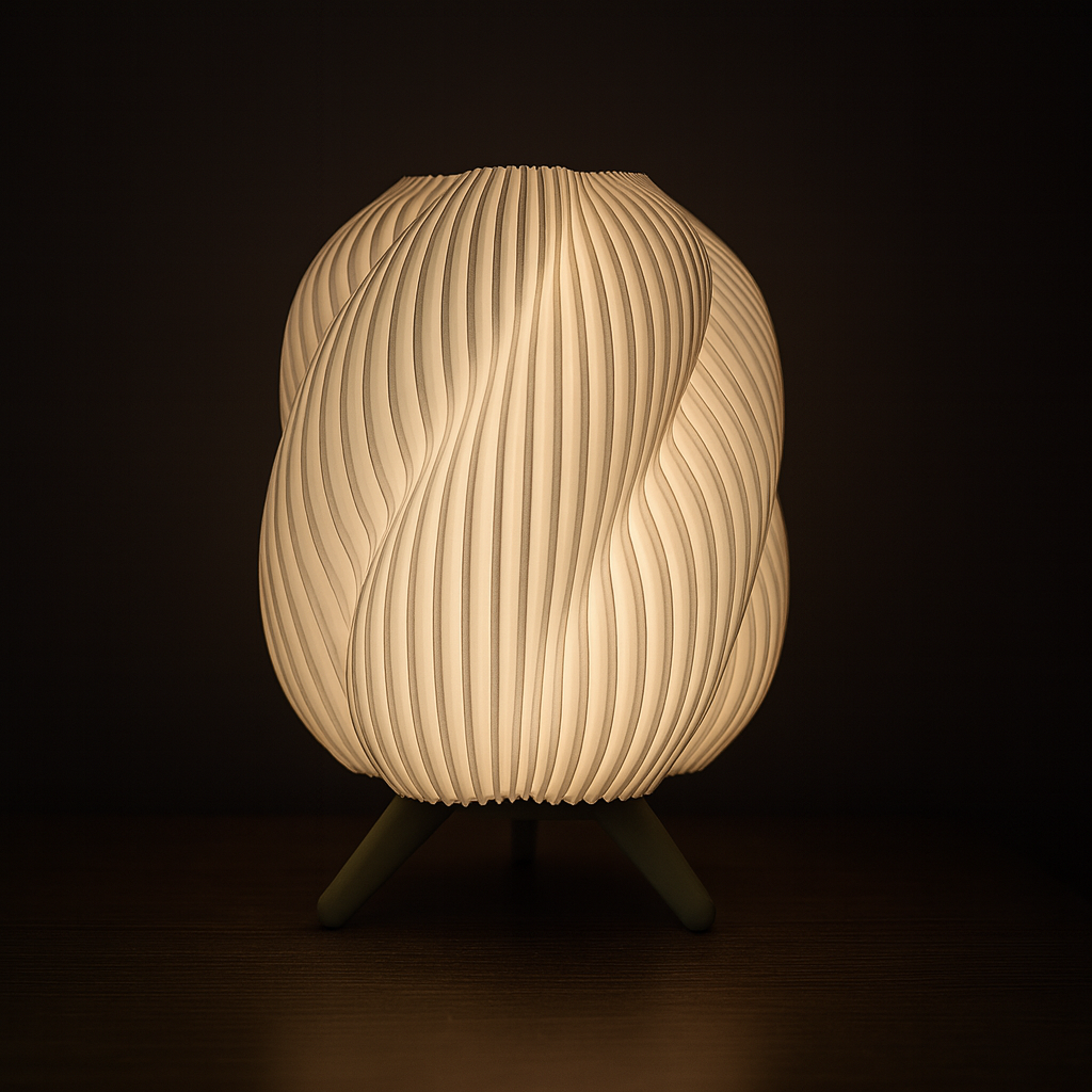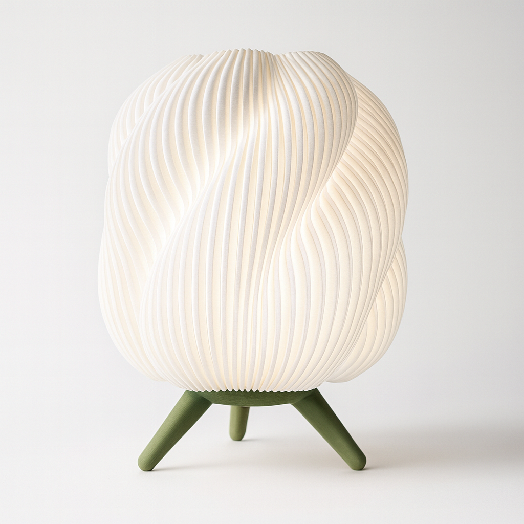 Lámpara de mesa estilo Onda, fabricada con impresión 3D. Su difusor ondulado genera luz cálida y uniforme, mientras la base de tres patas aporta estabilidad y diseño minimalista. Ligera, resistente y de bajo consumo.