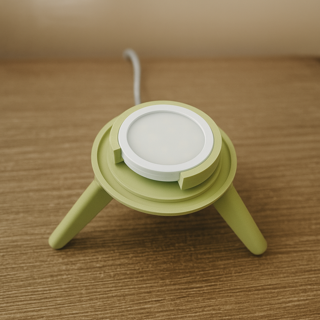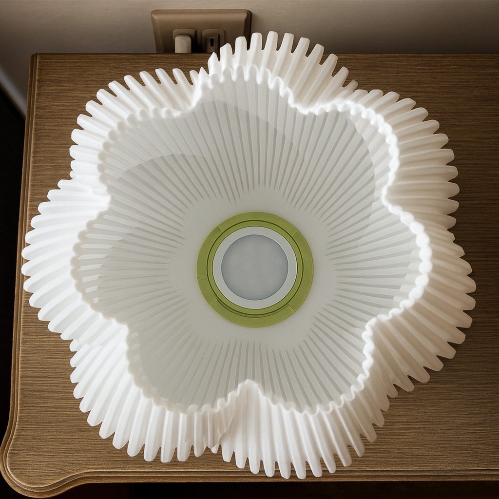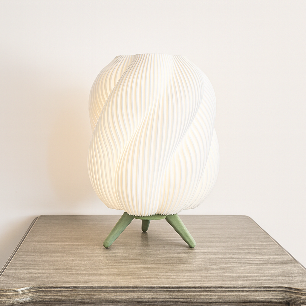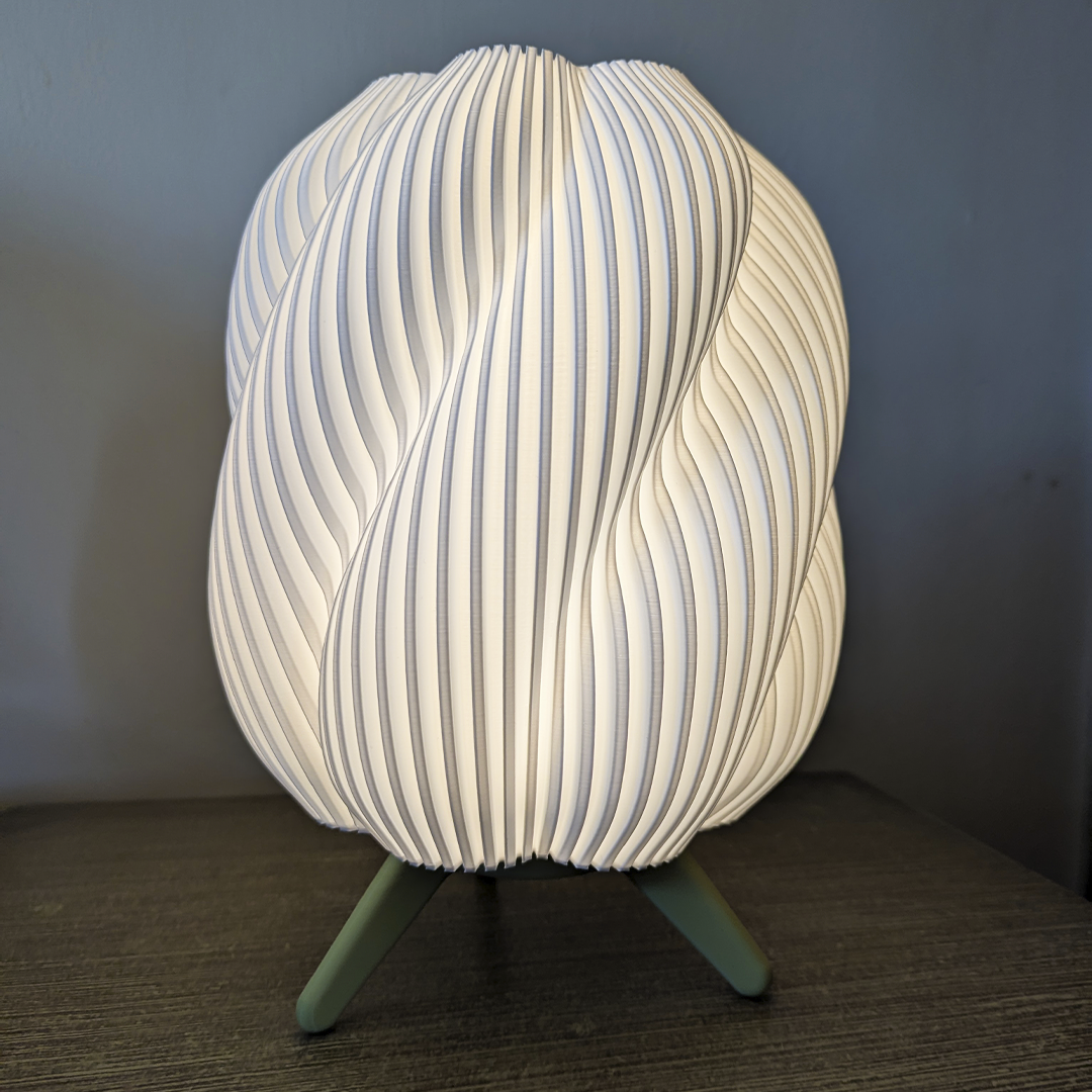 Lámpara de mesa estilo Onda, fabricada con impresión 3D. Su difusor ondulado genera luz cálida y uniforme, mientras la base de tres patas aporta estabilidad y diseño minimalista. Ligera, resistente y de bajo consumo.