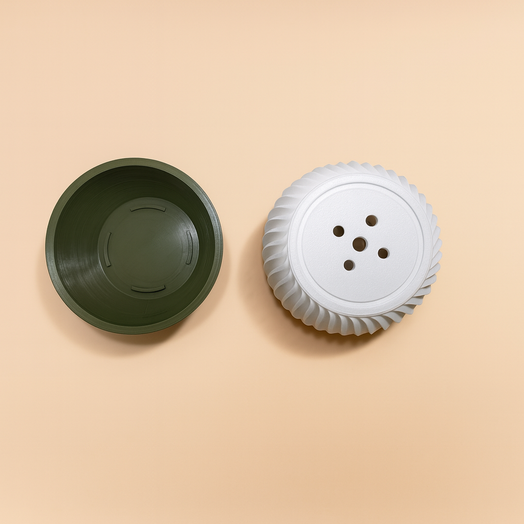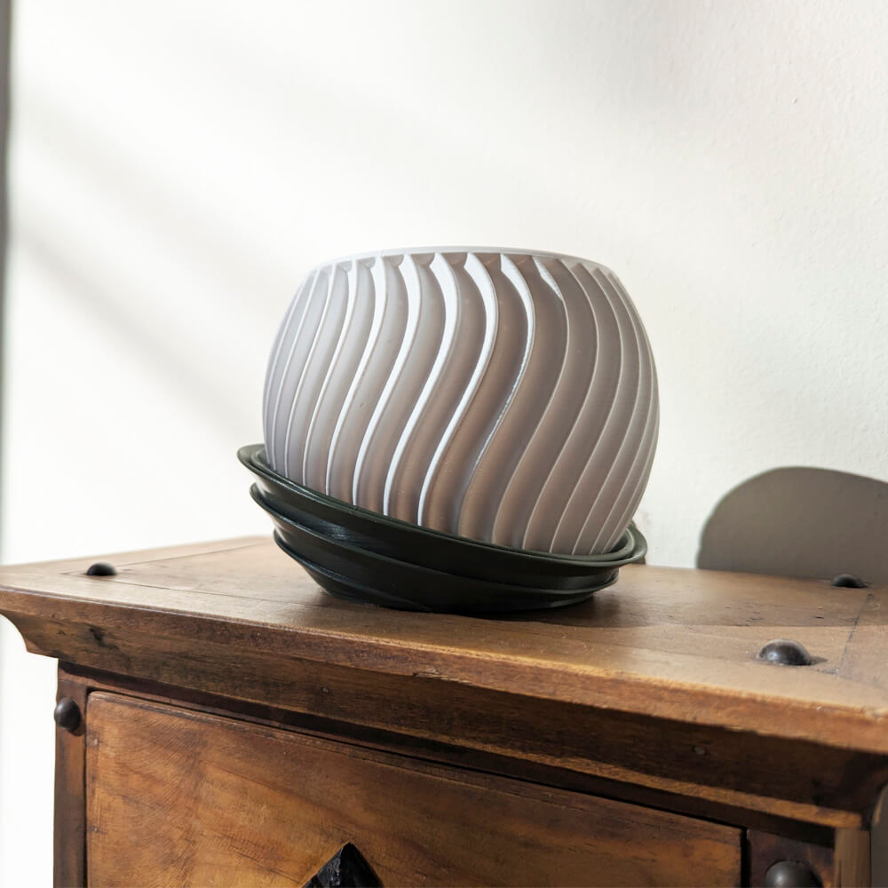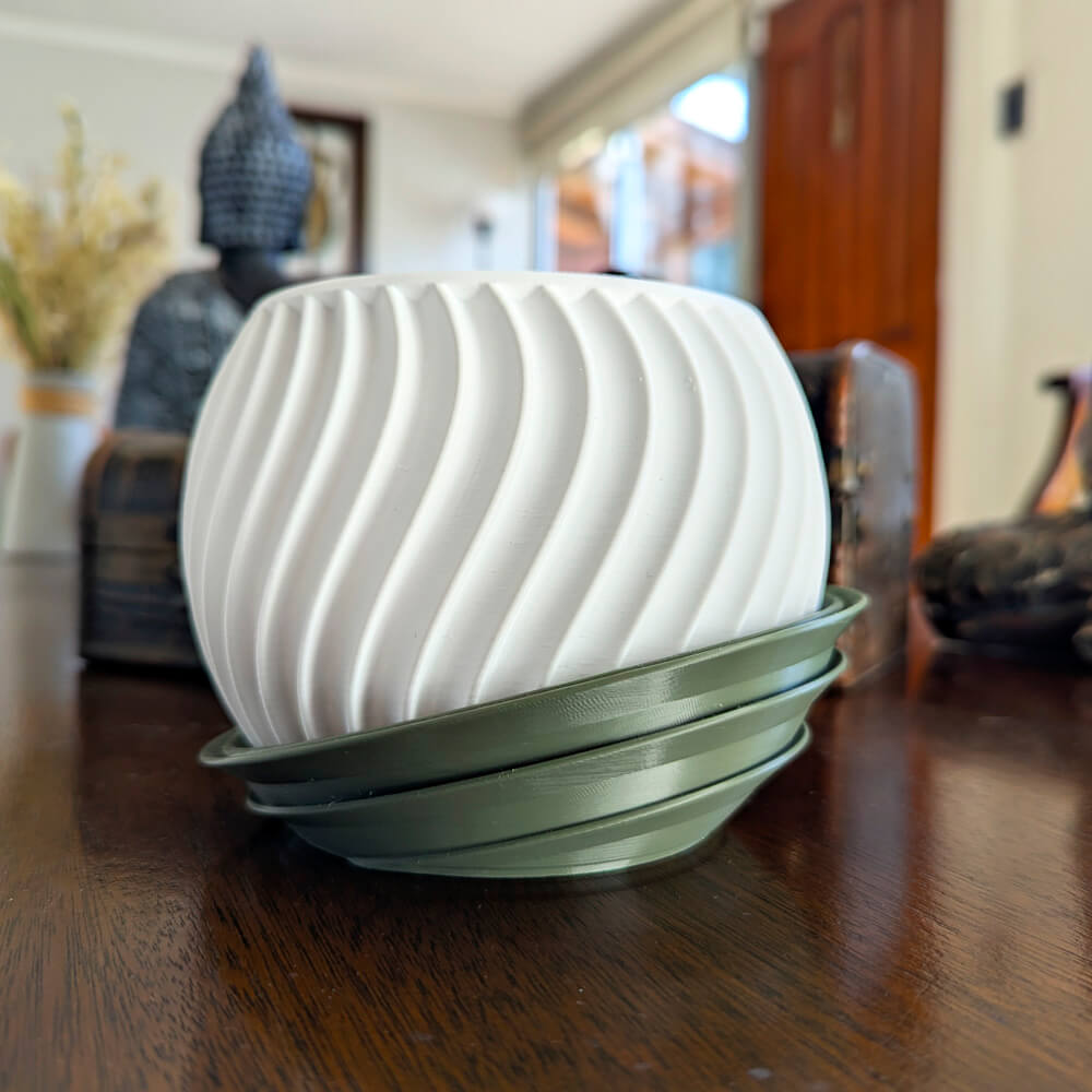 Ideal para suculentas, cactus y pequeñas plantas de interior, este macetero impreso en 3D es liviano pero duradero, por lo que puedes moverlo sin esfuerzo de la repisa al escritorio o la mesa del salón. Además, incluye un platillo verde oscuro que protege tus superficies y añade contraste sin restar protagonismo a la maceta.