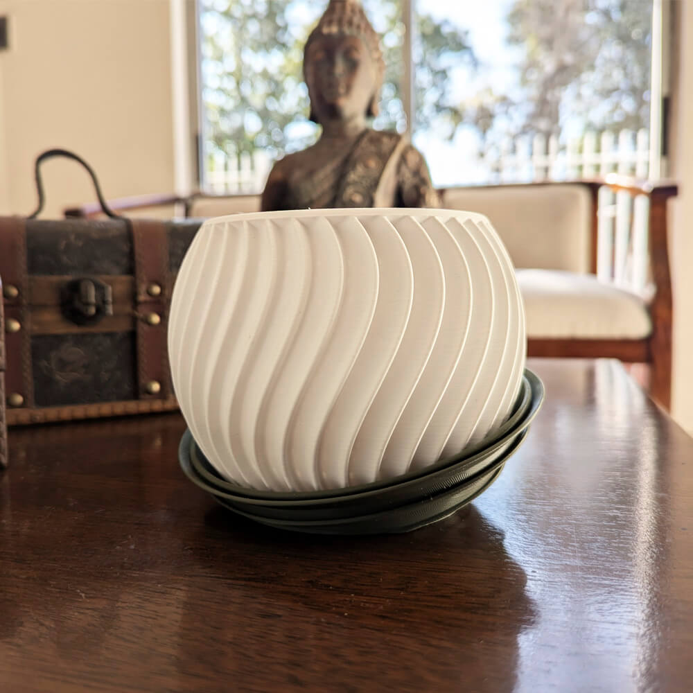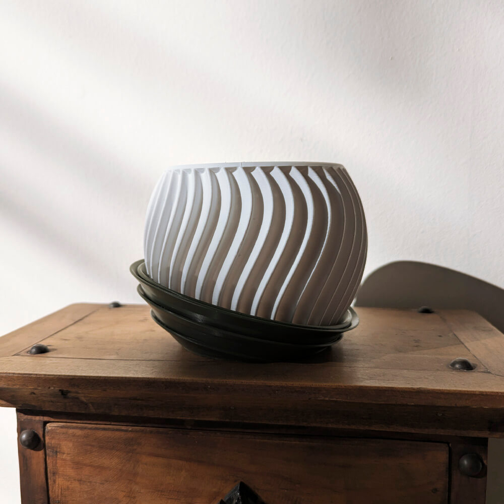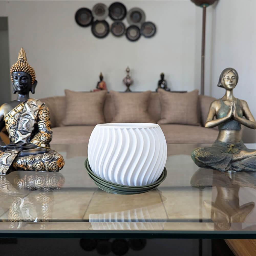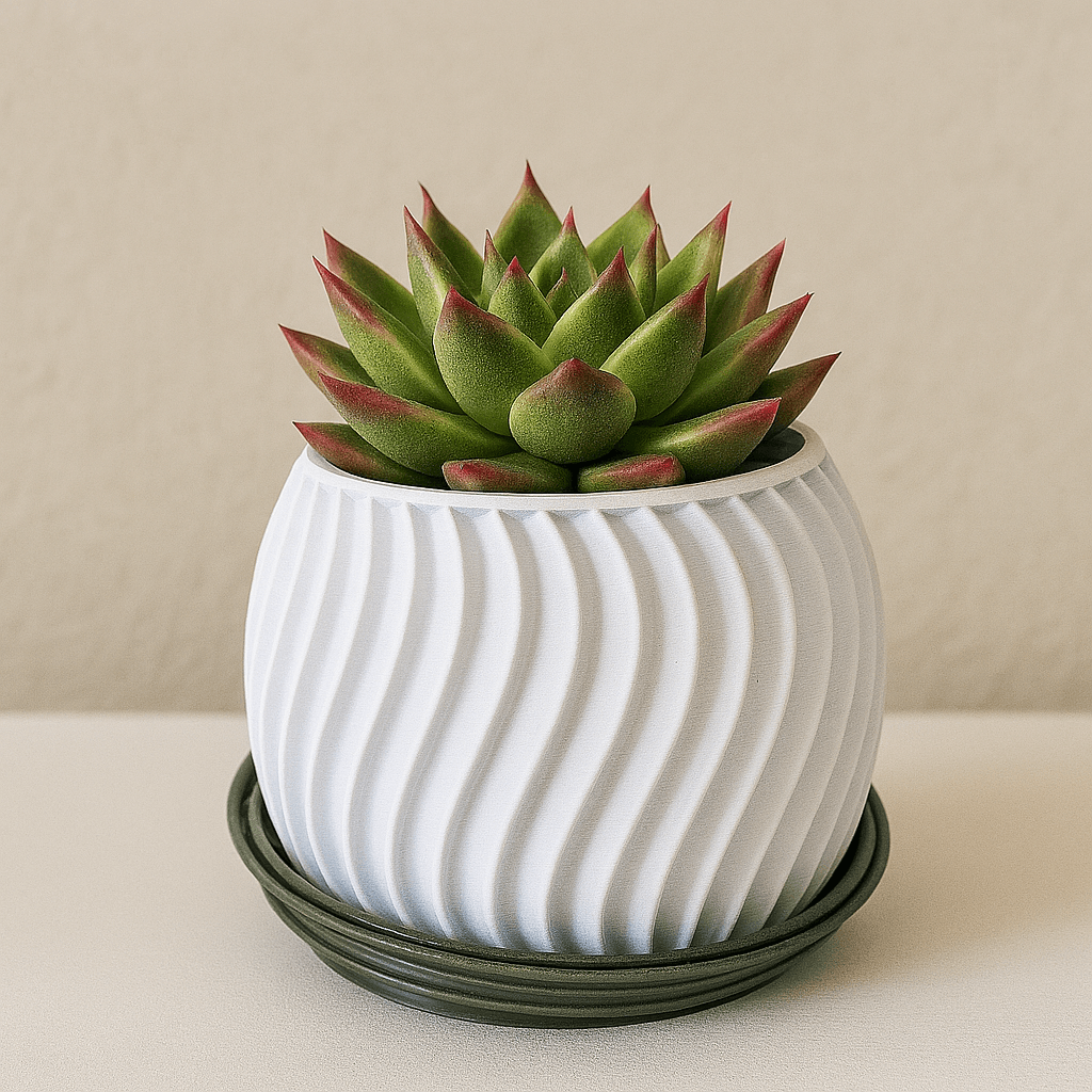 Fabricado con PLA ecológico. 🌿. Dale un toque fresco y elegante a tu hogar con este macetero 3D blanco de forma ondulada. Ligero, resistente y perfecto para realzar la belleza de tus suculentas favoritas. 🏡