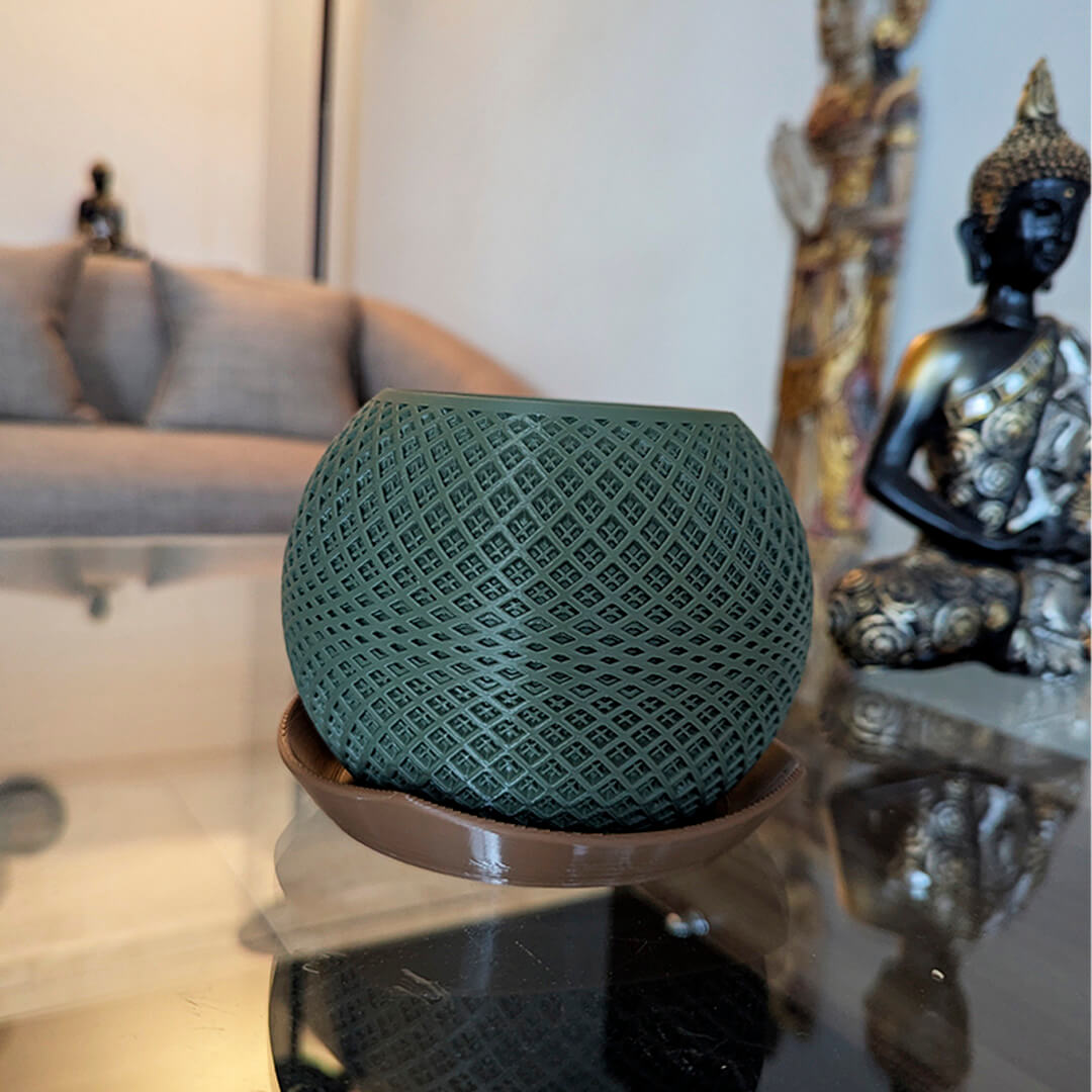 Está fabricado con materiales ecológicos ♻️ que cuidan el medio ambiente y te permiten decorar con conciencia. Ligero, resistente y con una base que evita filtraciones de agua, es ideal para colocar sobre escritorios, repisas o mesas sin preocupaciones. Cada pieza es impresa en 3D, lo que garantiza un acabado moderno y único, sin producir residuos contaminantes 🌍.